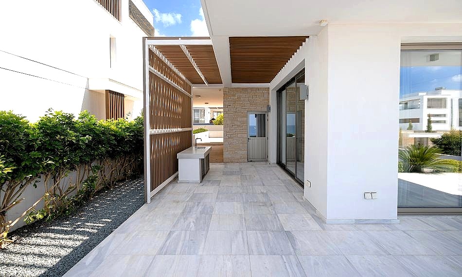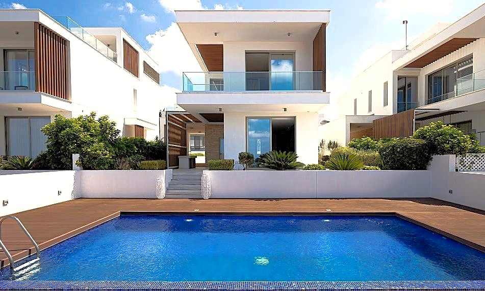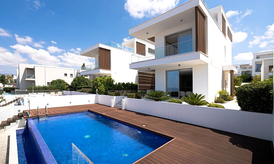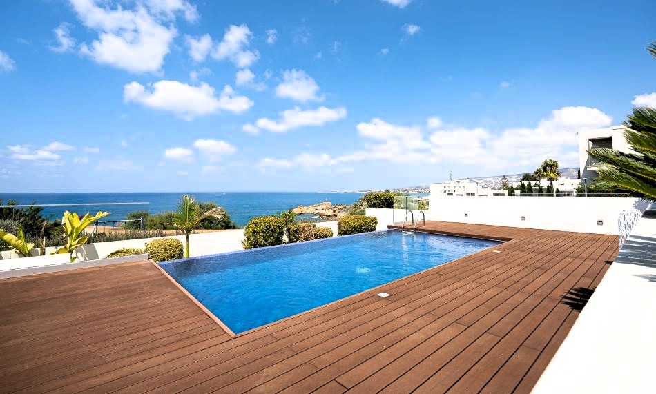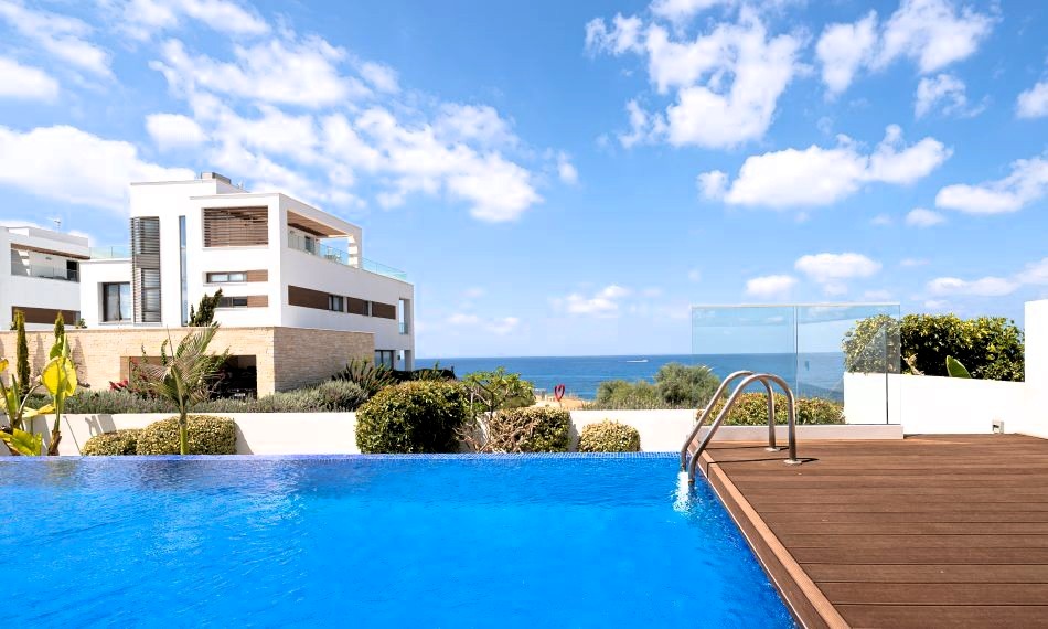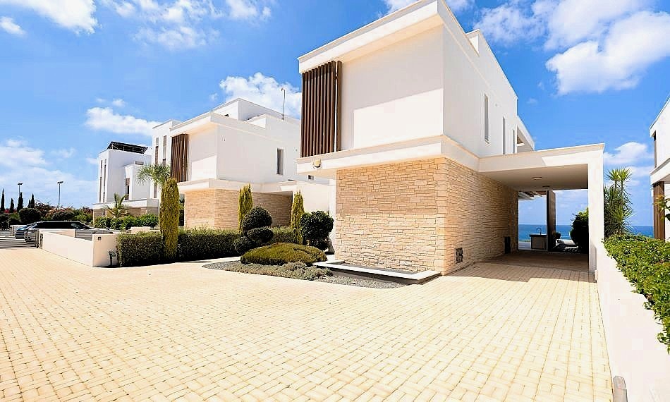 This magnificent four-bedroom luxury villa for sale is located on the seafront in the prestigious Kissonerga area. It occupies a privileged waterfront location in a modern gated community, offering unobstructed sea views and the invigorating sea air.